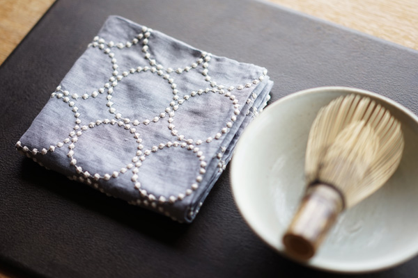 専ら茶の世界で使われる帛紗ですが、そのきっかけは利休の妻宗恩が利休にもたせた白い薬包布といわれています。それを気に入った利休が茶席で使い始めたとか。約30㌢四方の方形の布ですが、二つ折り、四つ折り、八つ折りなどにして茶では使われています。私たちの提案は、サイズ感もよく、使い勝手もよい帛紗を日常のさまざまな場所で使っていただけたらと思うのです。